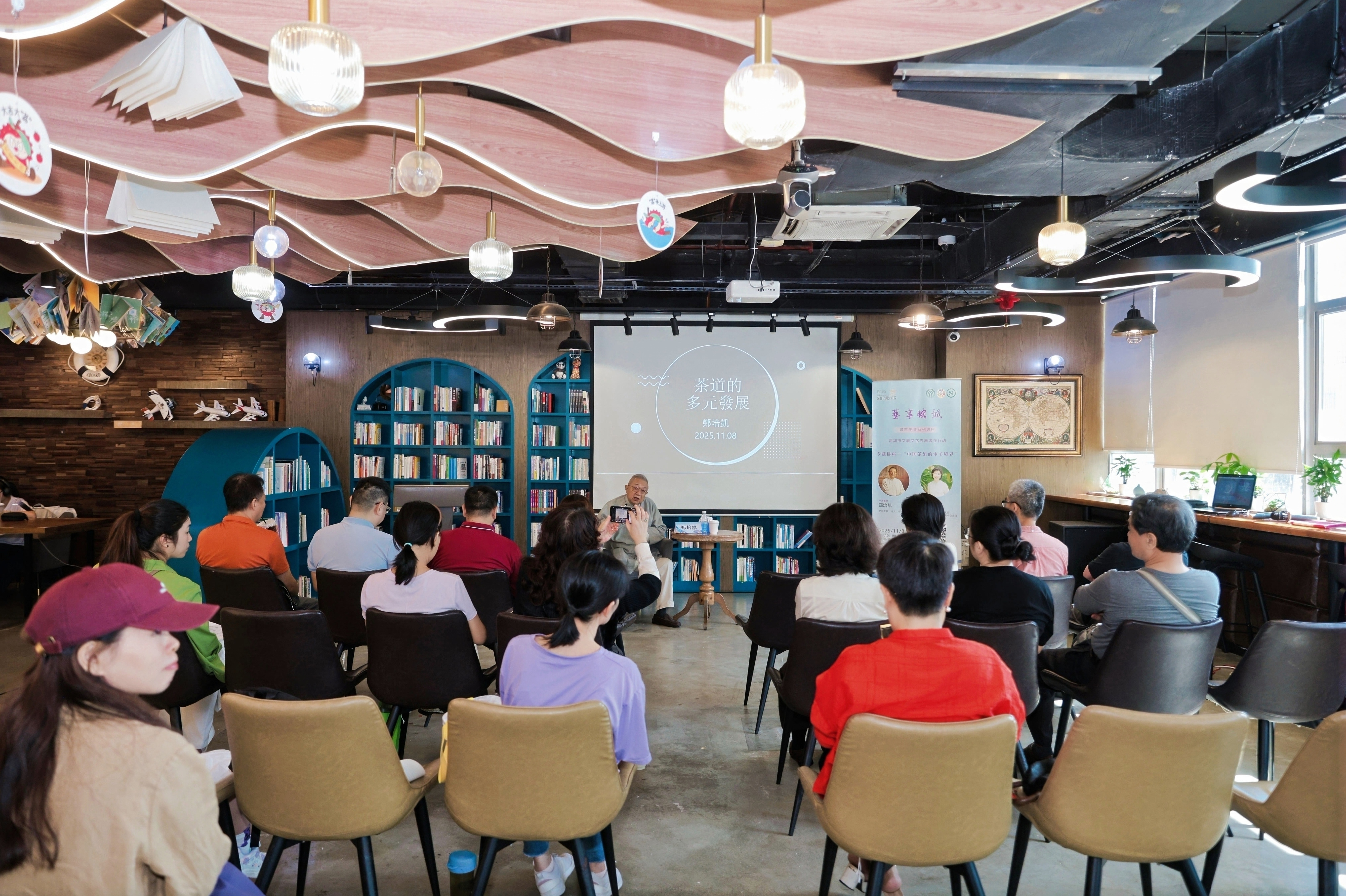 11月8日,2025年深圳全民艺术季活动“艺享鹏城”之“艺+和谐社会”城市美育系列讲座首讲“中国茶道的审美境界”在深圳市盐田区图书馆开讲。著名文化史家、诗人、书法家郑培凯担纲主讲,广东省首批高校美育名师王婷与其对谈。